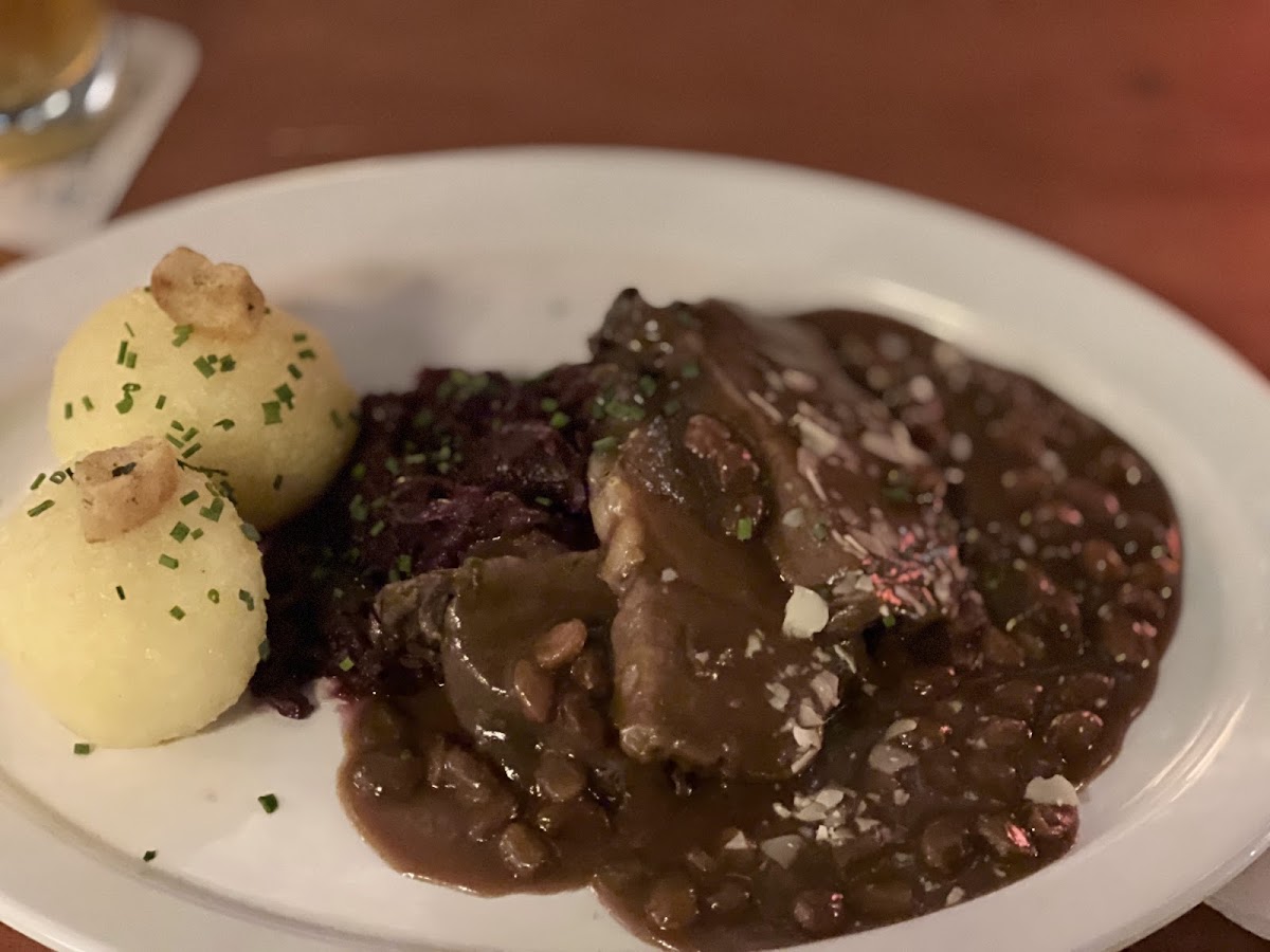 For a Thursday night in Hannover, the atmosphere was lively. The food was great and came quite fast, as did the many drinks! I had the sauerbraten and it was delicious!